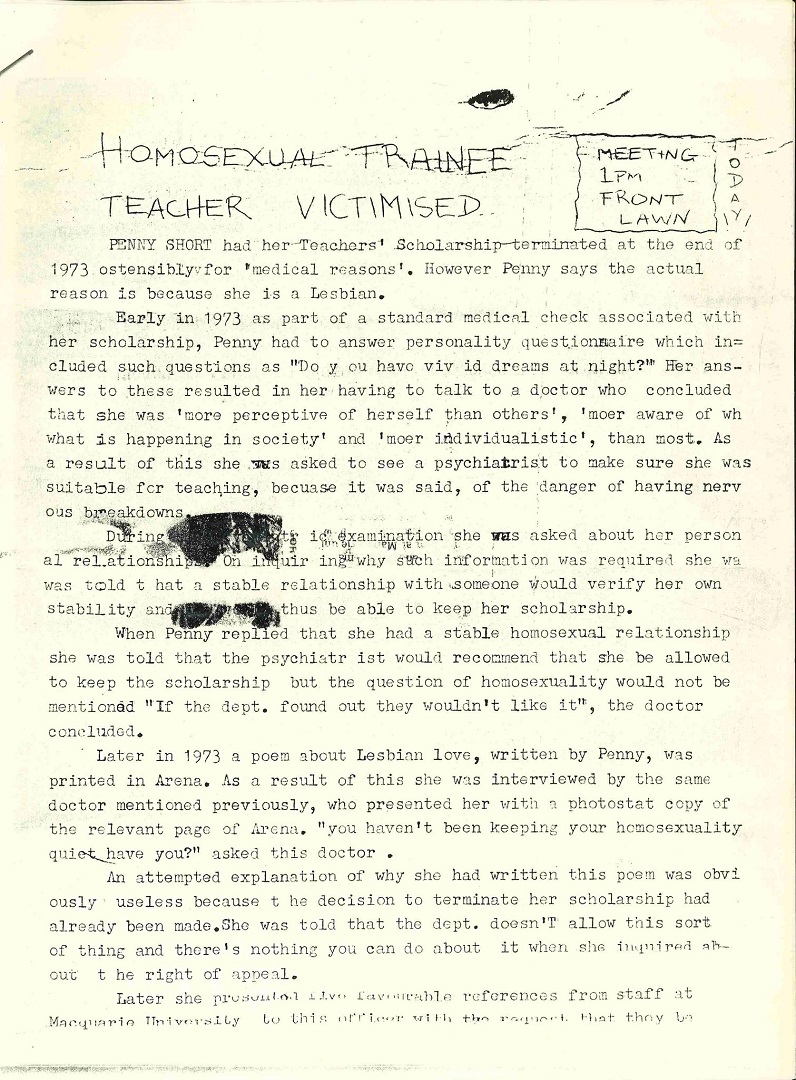 Dr Sue Wills (1944-2022) was a pioneer of the gay and women’s liberation movements, she was also an archivist and historian who spent her life in service to a vision of social equality. Her appearance with her then-partner, Gaby (Gabrielle) Antolovich, on the ABC current affairs program, Four Corners, is often overshadowed in discussions of that program by Peter de Waal and Peter Bonsall-Boone’s on-air kiss. But Sue and Gaby spoke eloquently to large audiences about their lesbianism and their lives, shaping early attitudes. Sue was one of the first to draw attention to, and to campaign against the abuse of gay people by the psychiatric profession, including its use of aversion therapy, in articles and interviews that still resonate today.