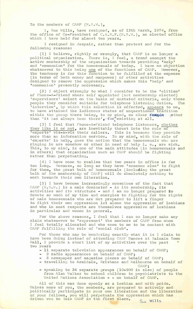 The Papers of Sue Wills largely comprising the records of the Campaign Against Moral Persecution (CAMP) Women’s Association, or CWA, as well as material relating to Campaign Against Moral Persecution (CAMP) NSW, the Penny Short case, aversion therapy, and gay liberation.