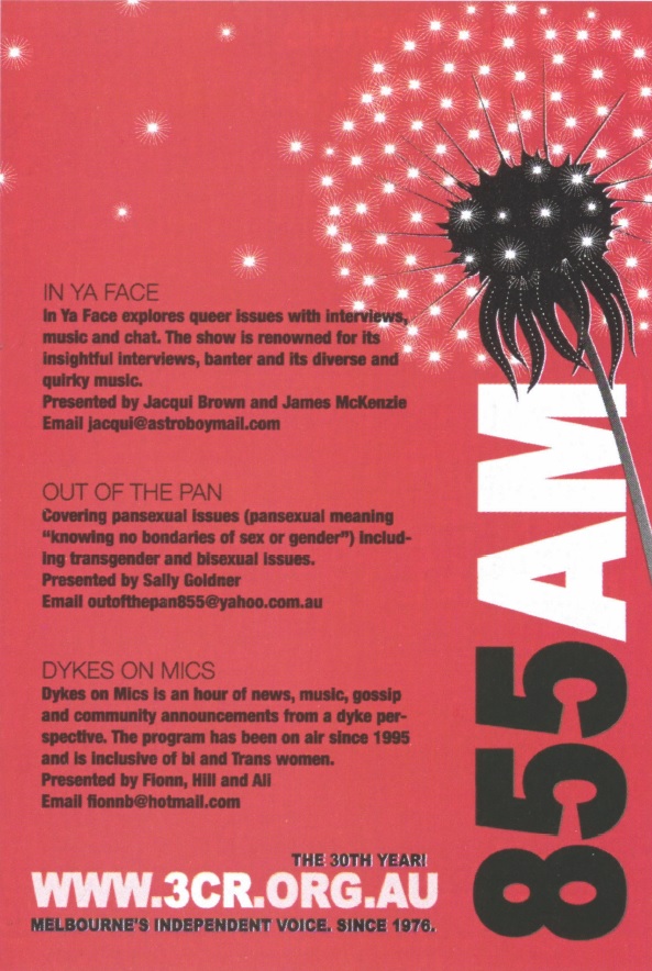 The Out of the Pan Collection comprises almost 600 digital podcast recordings broadcast on 3CR between 2008-2014, produced and compered by Sally Goldner AM. The program focuses on pansexual issues, with the program tagline noting that pansexual means “knowing no boundaries of sex or gender”, and included transgender, bisexual and polyamorous issues. Sally Goldner is a broadcaster, writer, speaker, and performer, who has been involved in Victoria’s queer community since the 1990s through key roles with Transgender Victoria, Transfamily and Bisexual Alliance Victoria.