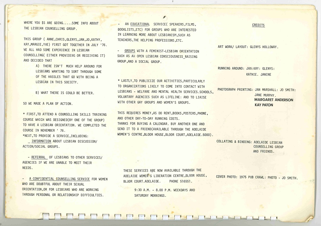 The 1977 Dykes’ Diary was produced by the Adelaide Lesbian Counselling Group as a fundraiser, with artwork/layout by Glenys Holloway, with photos by Jo Smith, Jane Murphy, Carlene Vicary, Jo March, Lin Cooper, Penny Chapman, Kathie Logan, and Erika Addis. The cover photo is of a 1975 pub crawl by Jo Smith.