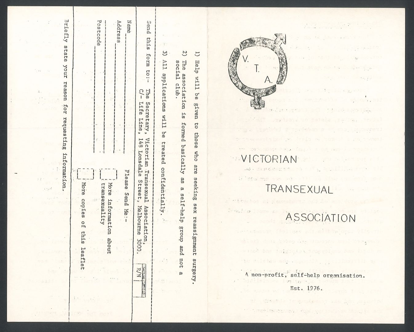 The Victorian Transexual Association (1976-c.1985) was established as a support group, in conjunction with the Victorian Transexual Coalition lobby group, in 1976; following on from the creation of the Gender Dysphoria Clinic at Queen Victoria Hospital, now Monash Gender Clinic.
