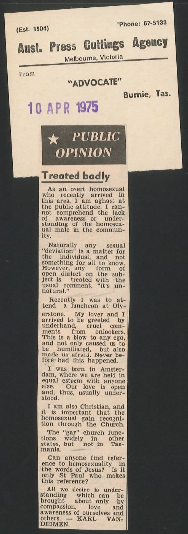 The Advocate (Burnie, Tas.) printed the following letter from a Karl van Dieman, deploring homophobia, and calling for compassion, love and awareness of ourselves and others: