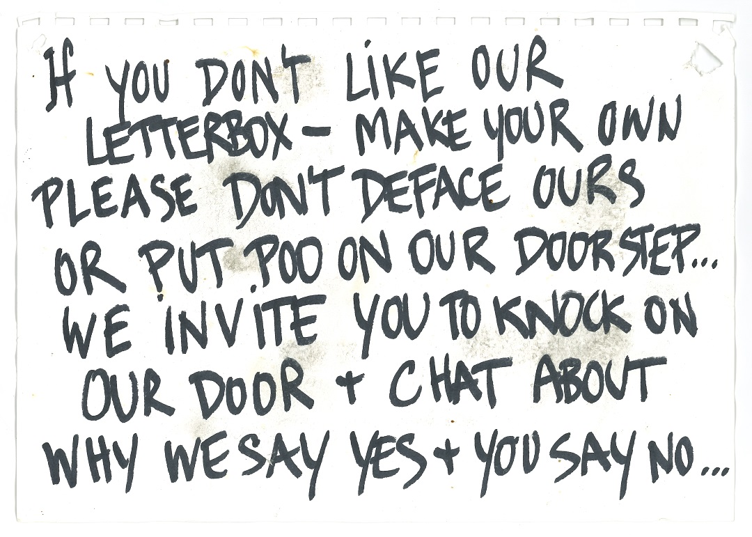 This marriage equality letterbox was designed by Sydney artist Mickie Quick as a fundraiser for Camp Out, a kid’s camp for LGBTIQ+ teenagers, and purchased by arts producers Fiona Winning and Harley Stumm to express their support for LGBTIQ+ friends and marriage equality. Within days of putting the letterbox up it had been vandalised multiple times. Fiona subsequently penned notes for their front fence for the vandals. AQuA holds a wealth of material documenting activism around marriage equality.
