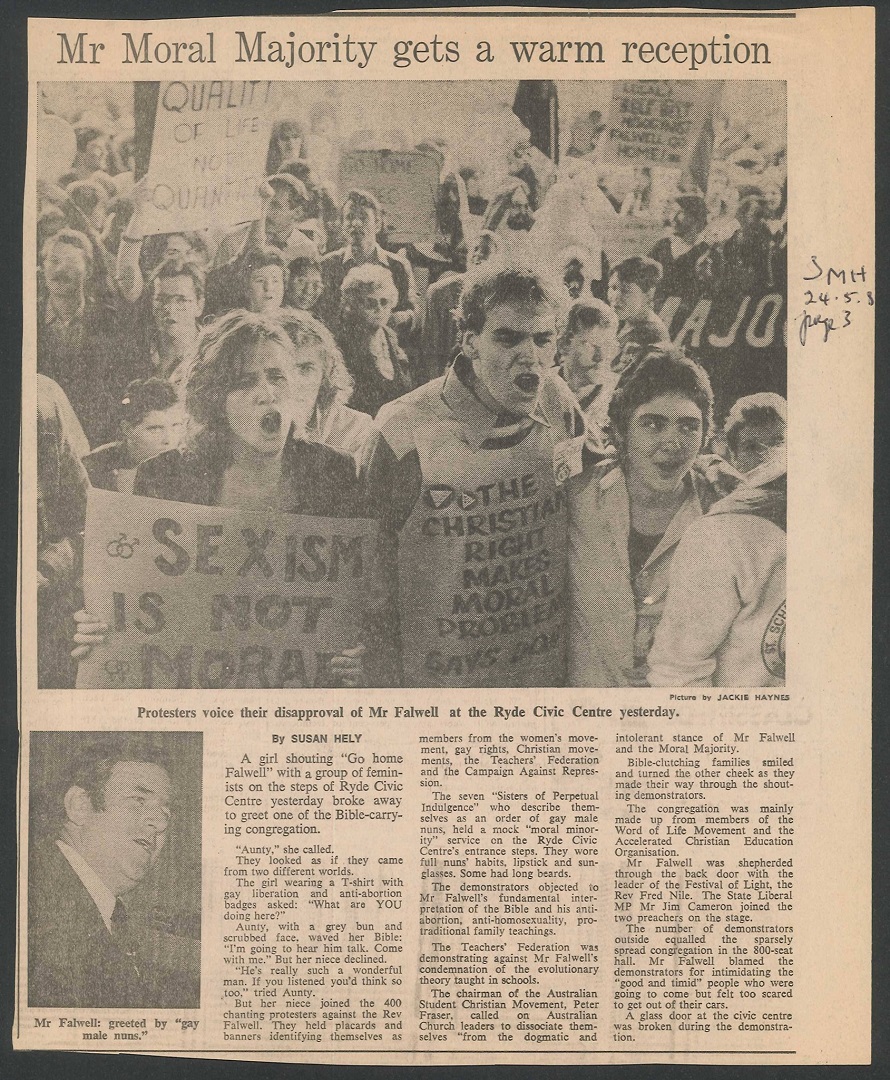 In 1982 American conservative Christian lobbyist, televangelist and ‘Moral Majority’ leader Jerry Falwell toured Australia. In Sydney, Falwell’s visit was met by a coalition of gay and feminist activist groups called the Campaign Against Repression (CAR). CAR and along with activists around Australia, had registered Moral Majority as a business name in each state in advance of Falwell’s visit, producing car stickers with provocative slogans in the distinctive writing of Sydney activist Kendall (Ken) Lovett. These slogans also appeared on a series of overlays or bibs worn during the rally, hand-drawn by Lovett.See also: Timothy Jones’ essay on these bibs in Queer Objects / Chris Brickell and Judith Collard (editors) (Manchester University Press, 2019).