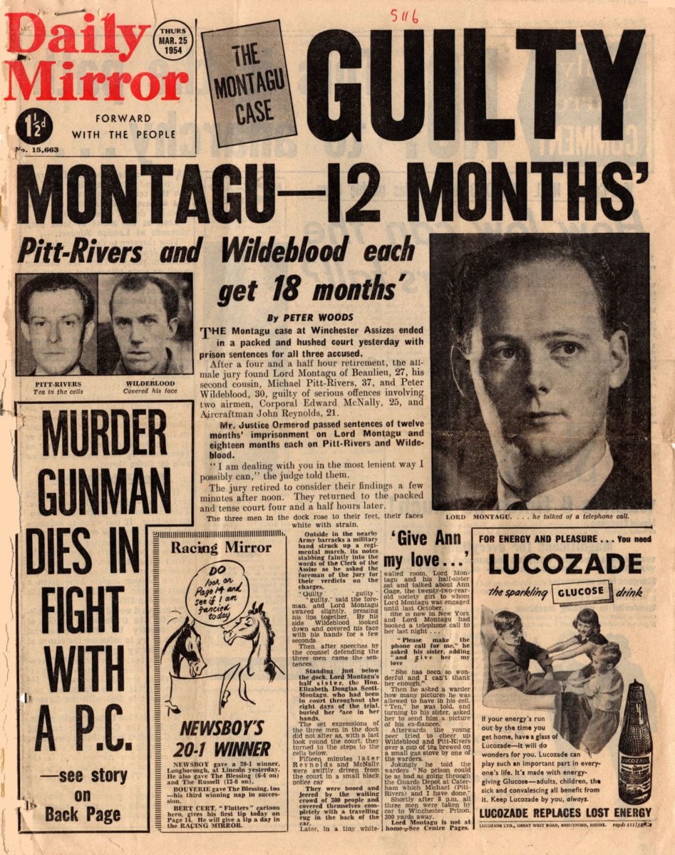 On January 9, police, in a series of coordinated raids, arrested Lord Montagu of Beaulieu, Peter Wildeblood, diplomatic editor of the Daily Mail and Michael Pitt-Rivers, a Dorset landowner. The three were charged with nineteen counts of sexual offences, including conspiracy, a charge last used in relation to homosexuality against Oscar Wilde. The arrests were timed for a Saturday afternoon, to ensure maximum attention from the Sunday press.