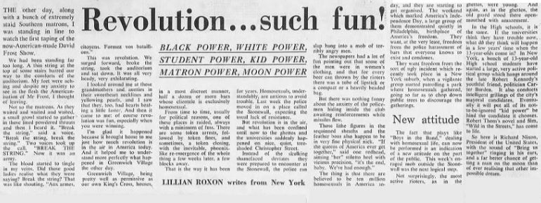A few arrests, a few warnings … all routine. Except that as people were released from the bar, they hung around. As those arrested were brought out to the paddy wagon, they struggled to free themselves. The crowd got angry. They heckled the cops, threw pennies at them, then beer cans, cobblestones … The cops retreated, barricading themselves inside the bar for safety, as the crowd tried to set fire to the building. Reinforcements arrived, order was restored – only to break down again on each of the next three nights as word swept through the homosexual community and crowds gathered to vent their rage.