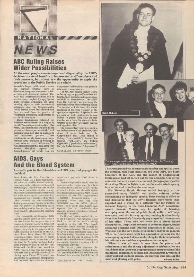 The local government sphere saw the election of lesbians and gay men in Sydney and Leichhardt and in Fitzroy in Melbourne Ralph McLean became Australia’s first openly gay mayor. And in Sydney a gay community meeting to discuss immigration voted to form the Gay (later Gay and Lesbian) Immigration Task Force – which was to prove one of the most successful lobby groups in our history.