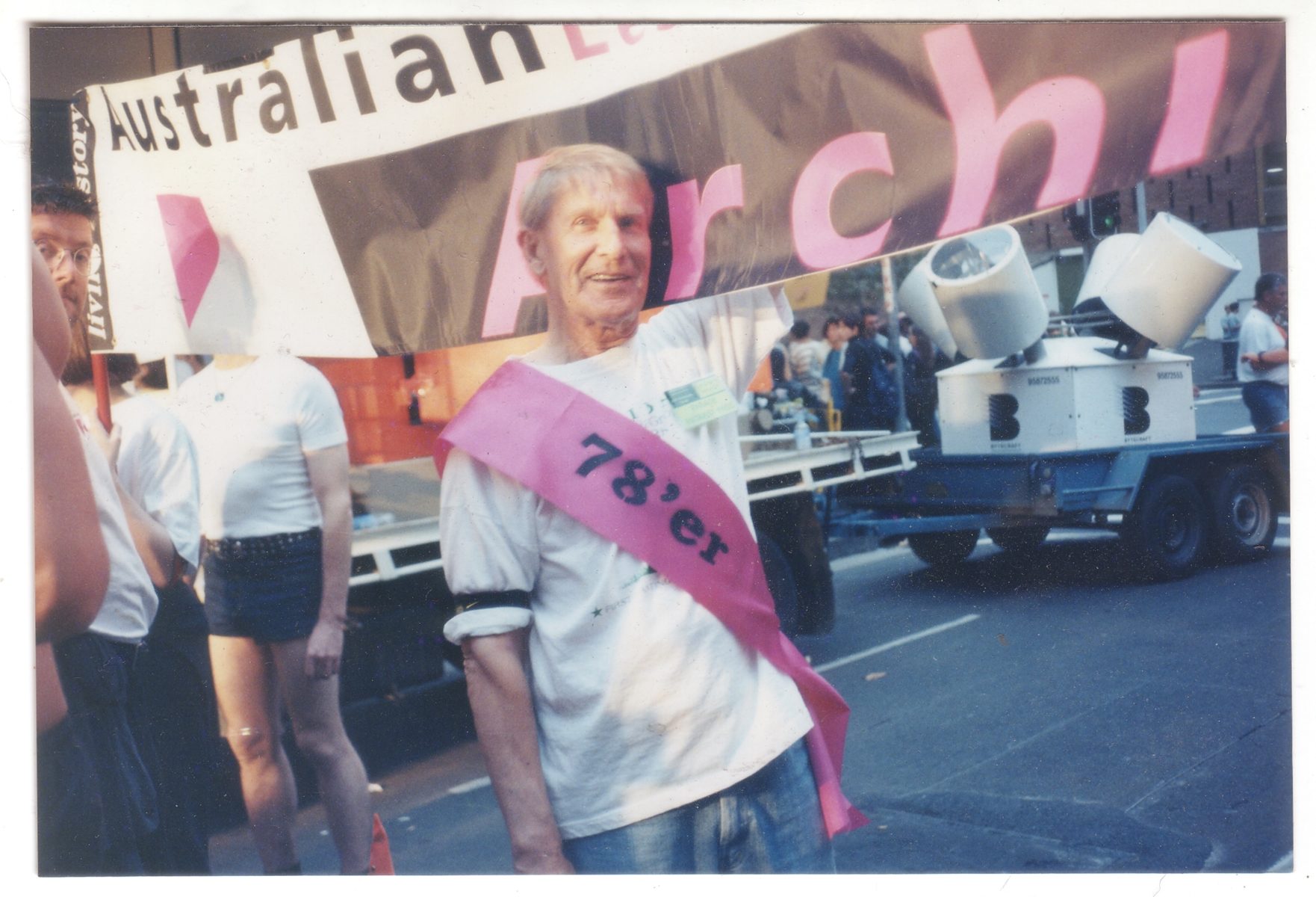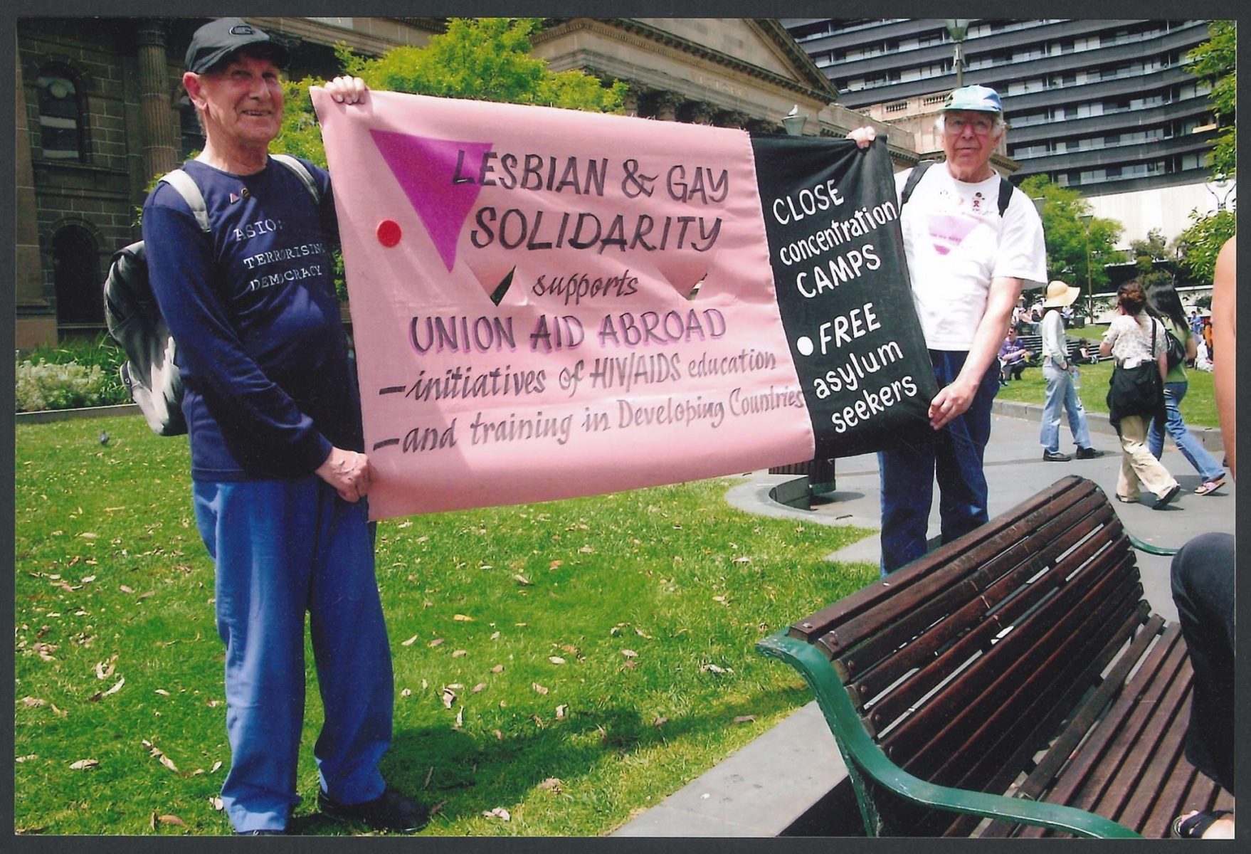 Ken’s tireless activism began in the mid-1960s when he joined the Albany Trust in London. Returning to Australia in the early late 1960s Ken participated in the 1972 gay liberation demonstration in support of Peter Bonsall-Boone, who had been dismissed from the Anglican church of St Clements at Mosman after coming out on the ABC Chequerboard program. From this time on Ken actively participated in protests throughout Sydney, Newcastle and Melbourne, which also featured his placards, banners, pinnies – all in his distinctive handwriting.