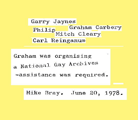 Graham Carbery’s efforts to this point had been largely undertaken as an individual, with the moral support of a few fellow activists, and he recognised the need to formalise the collecting and preservation work. To this end, he mentioned that a Gay Archives had been established in Melbourne and that he intended to discuss the proposal of establishing an Australian Gay Archives at the conference. Mike’s notes record: “Graham was organising a national gay archive – assistance was required.”