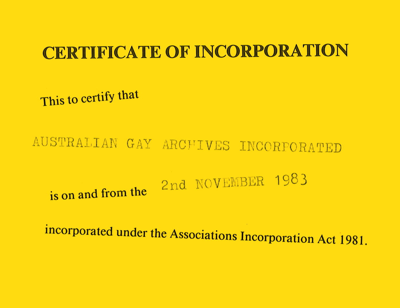 The incorporation of the Australian Gay Archives on the 2nd of November 1983 established it as a legal entity, with a constitution governing membership, office bearers elected by members, and rules governing its operation. In the first year following incorporation, Graham Carbery was president, Rob Thurling Vice-President, Mark Riley secretary and John Willis treasurer.