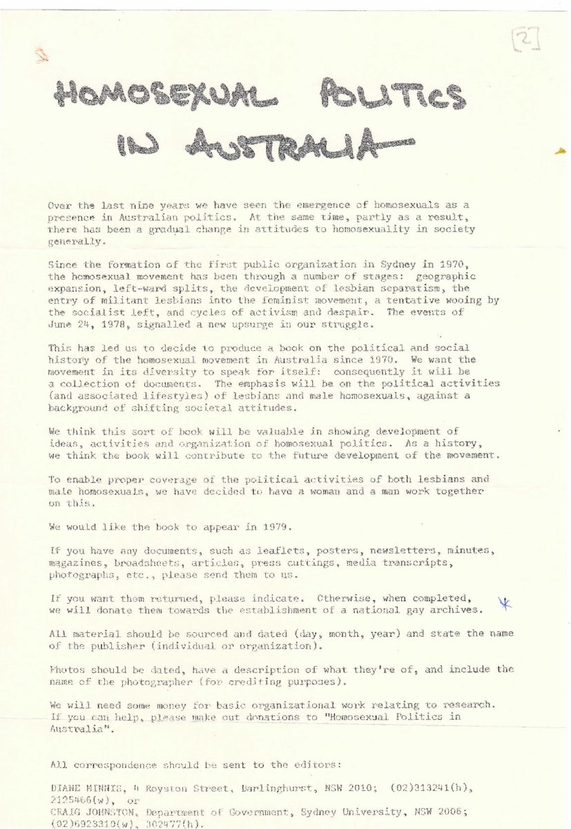 The idea of creating an Australian gay archive was in the minds of Di Minnis and Craig Johnston, two Sydney gay liberation activists, when they published a document titled ‘Homosexual Politics in Australia’ announcing their intention to: ‘…produce a book on the political and social history of the homosexual movement in Australia since 1970.’ In calling for material the document said: ‘If you have any documents, such as leaflets, posters, newsletters, minutes, magazines, broadsheets, articles, press cuttings, media transcripts, photographs, etc., please send them to us. If you want them returned, please indicate. Otherwise, when completed, we will donate them towards the establishment of a national gay archives.’