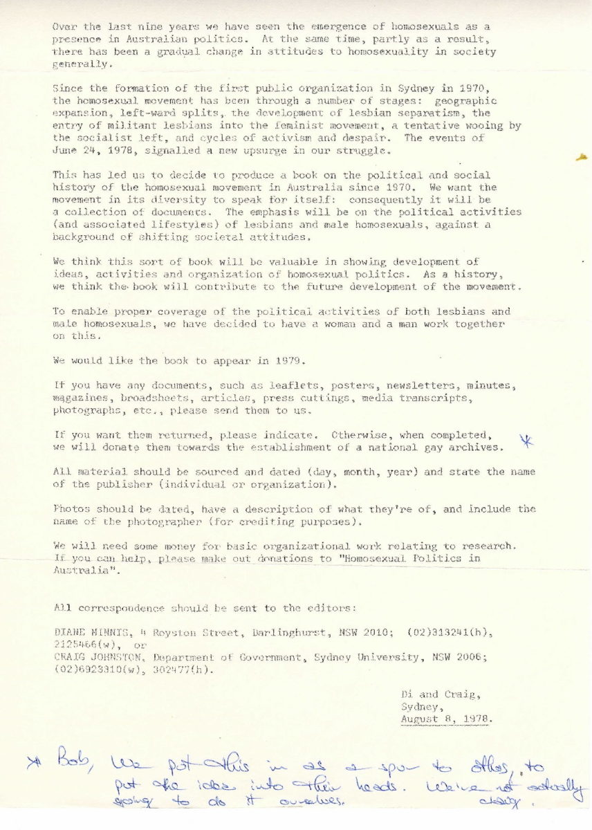 Minnis and Johnston did not plan to create an archive themselves, but wanted to encourage others to do so. A hand-written note by Johnston at the bottom of a copy of ‘Homosexual Politics in Australia’ sent by him to Robert French reads: ‘Bob, we put this in as a spur to others, to put the idea into their heads. We’re not actually going to do it ourselves.’ The proposed book did not eventuate but material for this project, collected by Johnston, Minnis and Phil Carswell, was later donated to the (then) Australian Gay Archives.