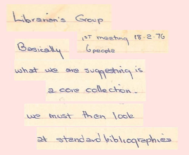The Gay Librarians Group was formed in Melbourne in March 1976. One of its founding members, Liz Ross, a trained librarian, had been compiling homosexual bibliographies since 1974. In a note for the group’s third meeting, Liz outlined what might constitute a ‘core collection’ on homosexuality, including books, special collections and ephemera files. At the fourth meeting, the idea expanded to include preparing bibliographies encompassing badges, photographs, pamphlets, journals and audio- visual materials.