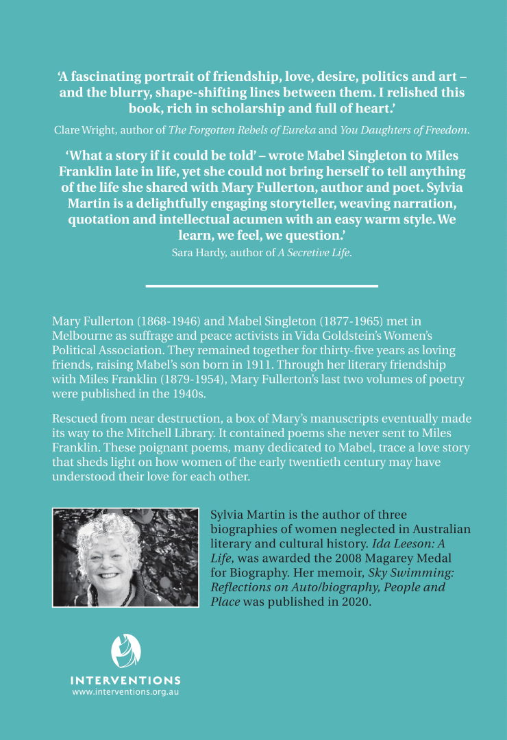 ‘“What a story if it could be told” – wrote Mabel Singleton to Miles Franklin late in life, yet she could not bring herself to tell anything of the life she shared with Mary Fullerton, author and poet. Sylvia Martin is a delightfully engaging storyteller, weaving narration, quotation and intellectual acumen with an easy warm style. We learn, we feel, we question.’
